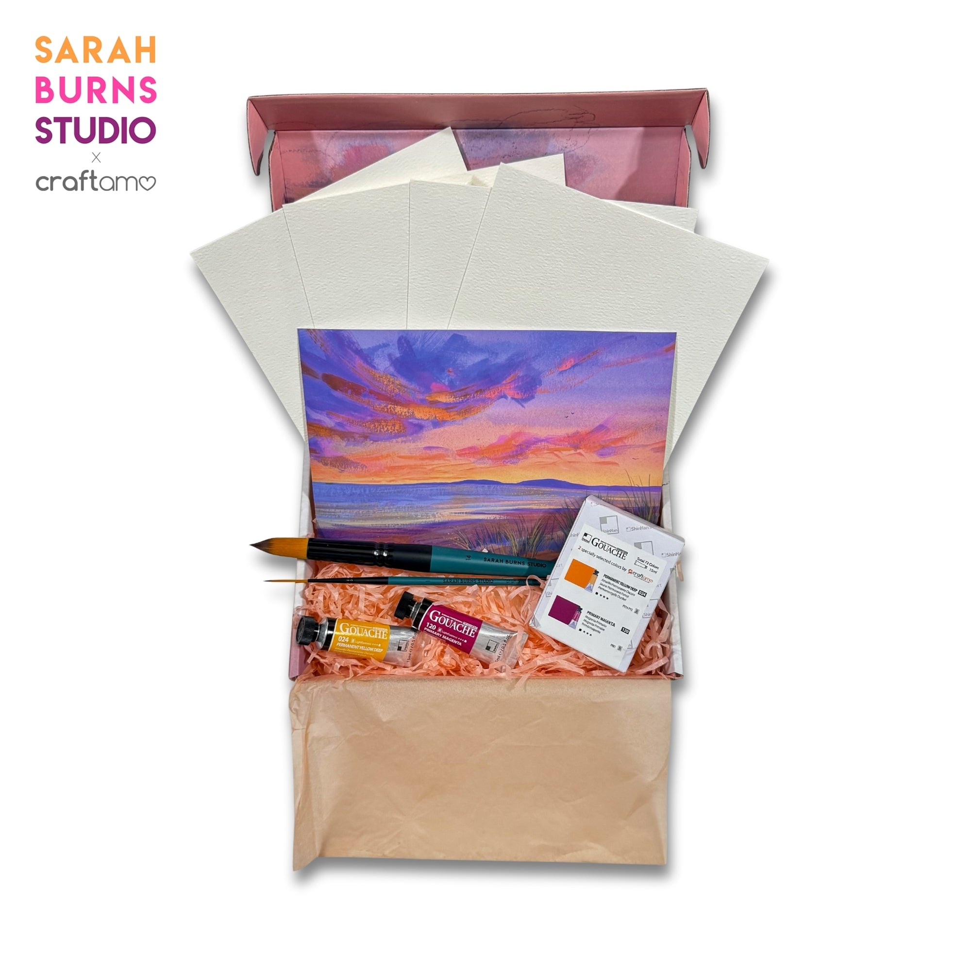 The Sarah Burns Studio X Craftamo Gouache Class in a Box Set is now available for individual purchase, bringing Sarah’s most loved painting supplies directly to your door in one beautifully packaged set. This edition is specially curated for artists who want to paint a Sunset, making it easy to recreate Sarah’s techniques through a step-by-step tutorial, with a clear focus and inspiration.