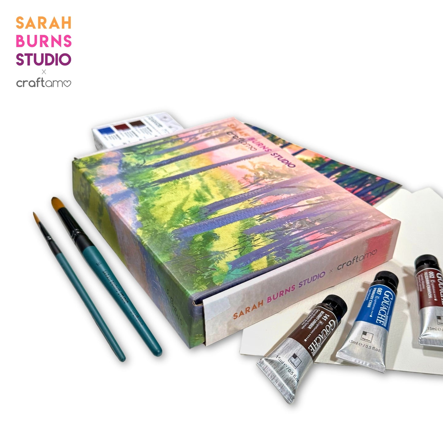 The Sarah Burns Studio X Craftamo Gouache Class in a Box Set is now available for individual purchase, bringing Sarah’s most loved painting supplies directly to your door in one beautifully packaged set. This edition is specially curated for artists who want to paint Forest Light, making it easy to recreate Sarah’s techniques through a step-by-step tutorial, with a clear focus and inspiration.