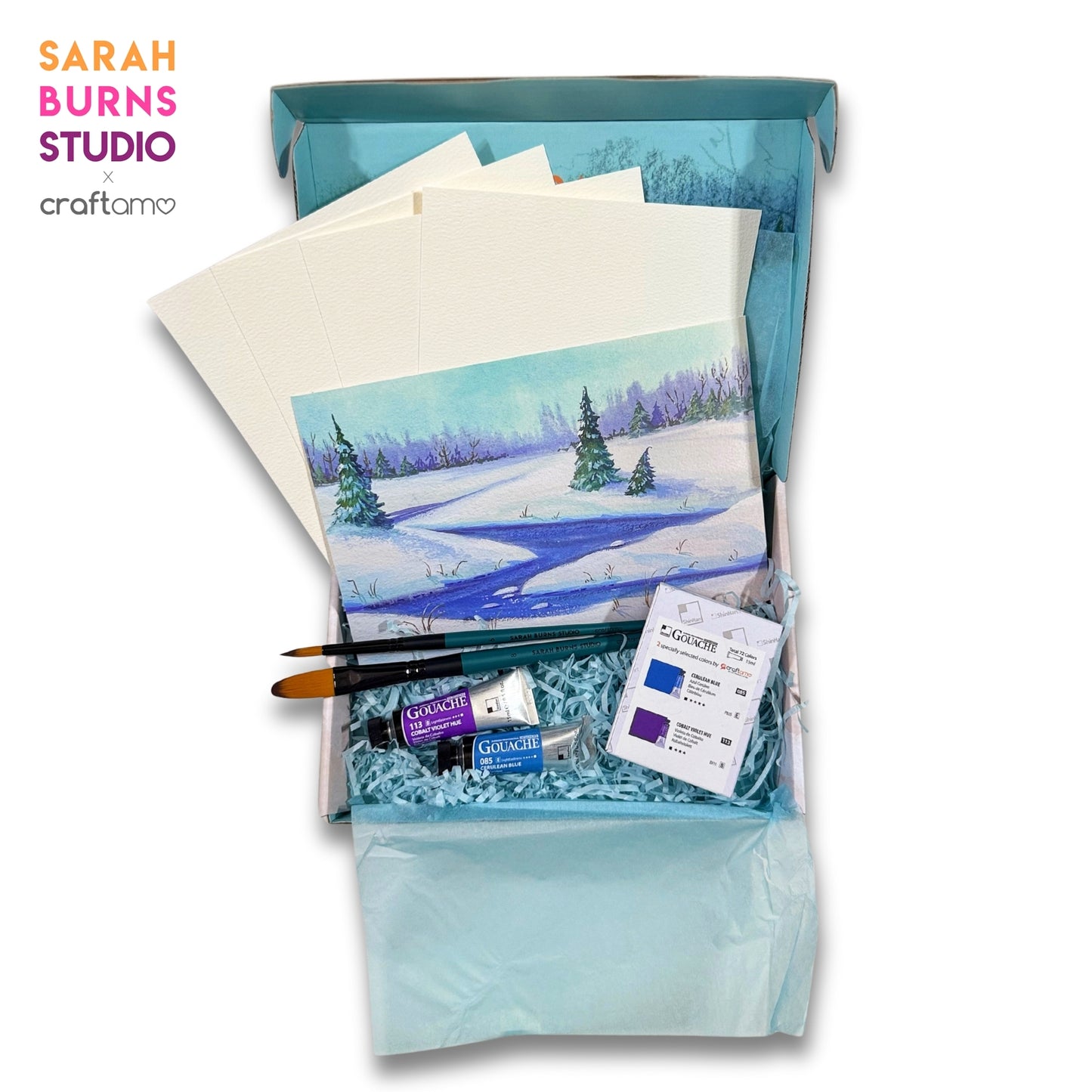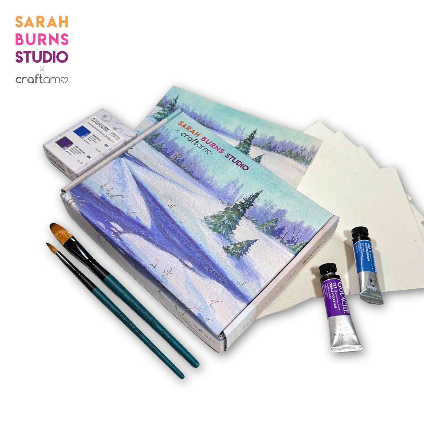 The Sarah Burns Studio X Craftamo Gouache Class in a Box Set is now available for individual purchase, bringing Sarah’s most loved painting supplies directly to your door in one beautifully packaged set. This edition is specially curated for artists who want to paint a Snow Scape, making it easy to recreate Sarah’s techniques through a step-by-step tutorial, with a clear focus and inspiration.