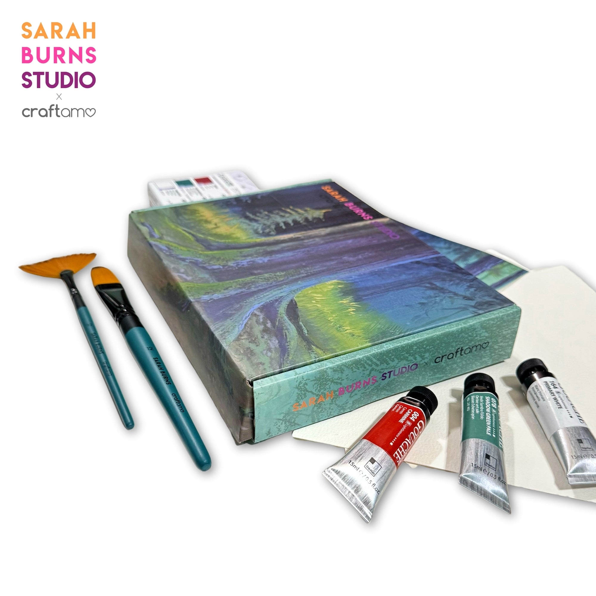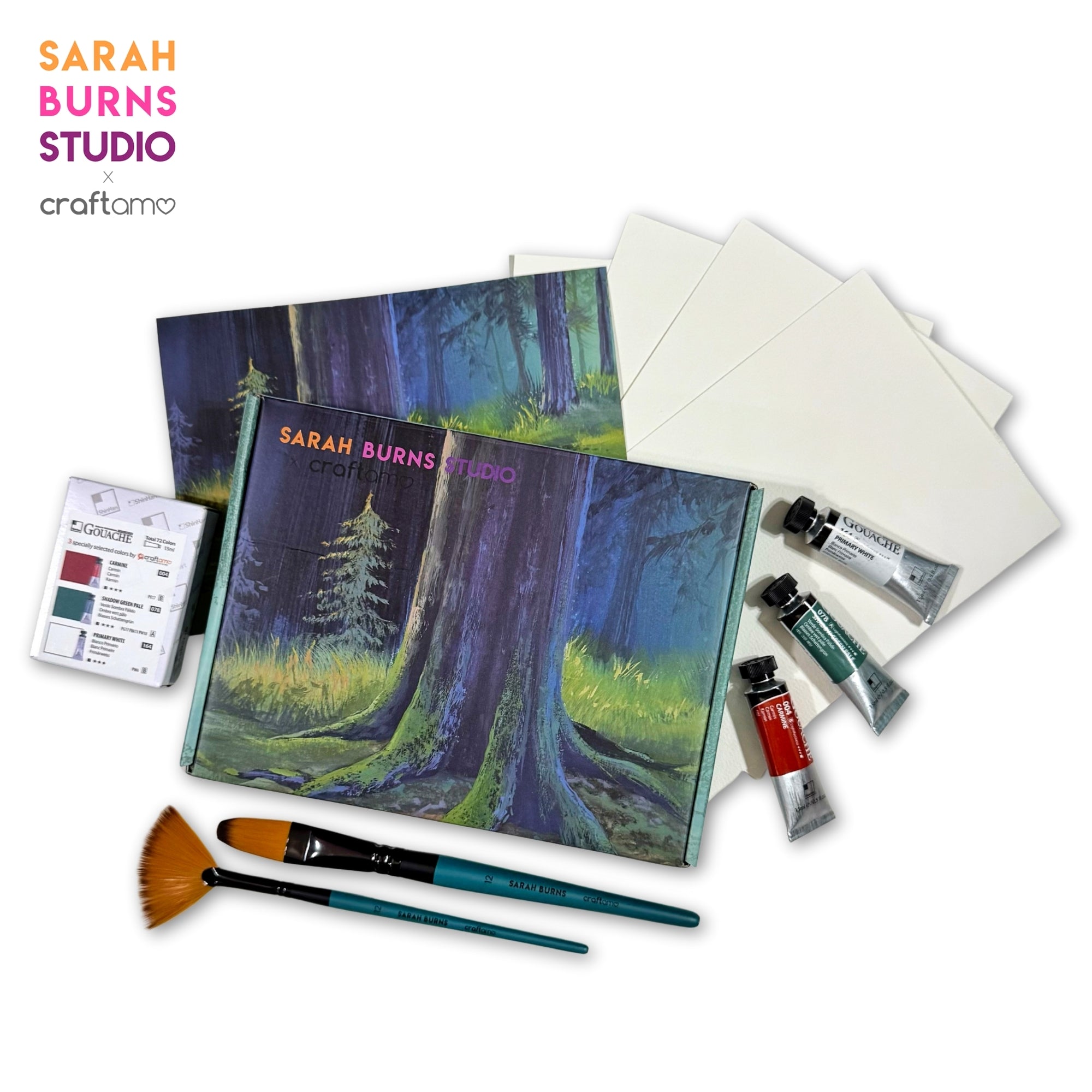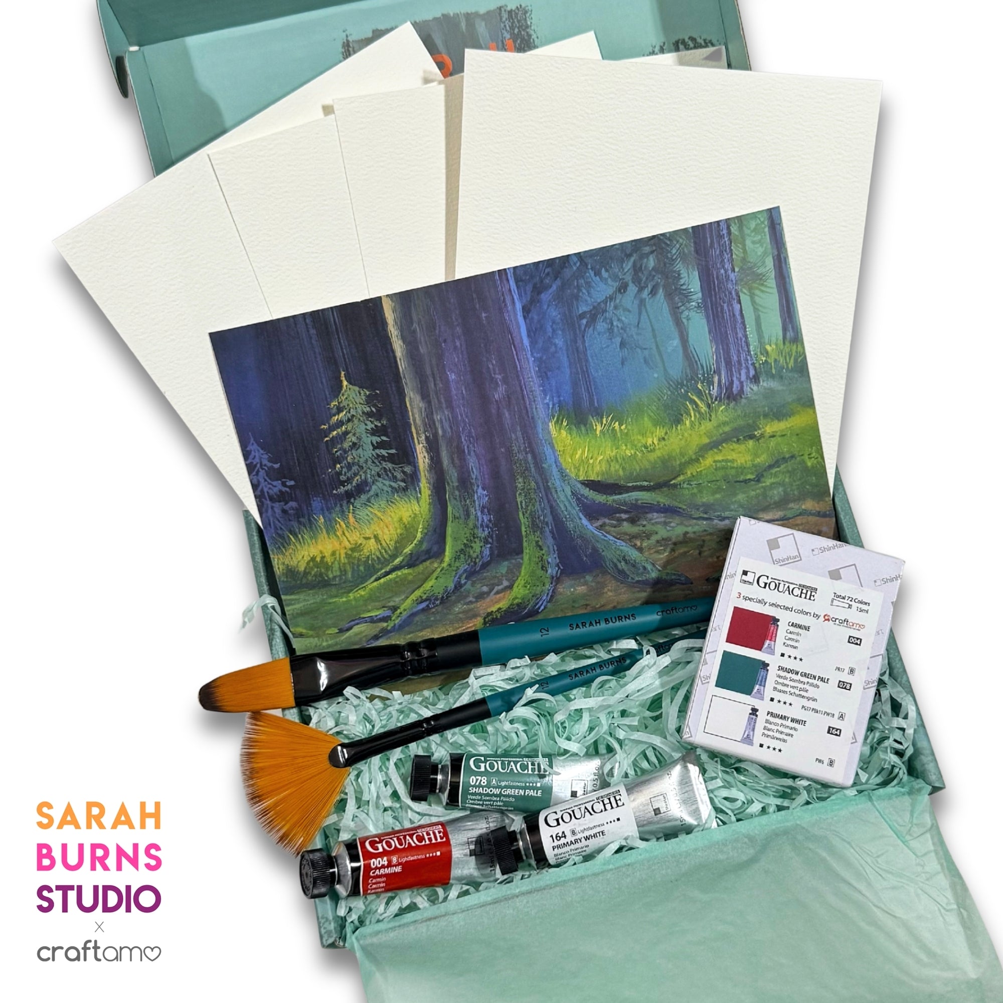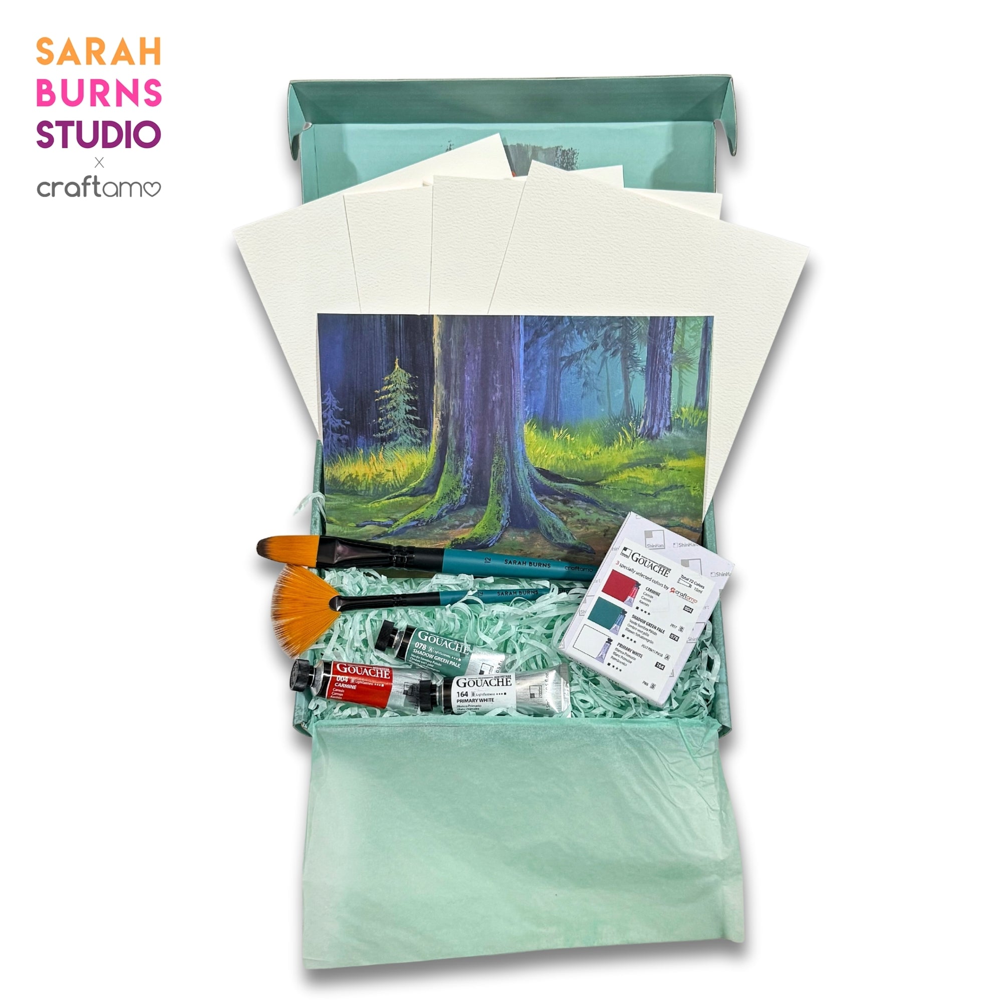 The Sarah Burns Studio X Craftamo Gouache Class in a Box Set is now available for individual purchase, bringing Sarah’s most loved painting supplies directly to your door in one beautifully packaged set. This edition is specially curated for artists who want to paint a Mossy Forest, making it easy to learn Sarah’s techniques through a step-by-step tutorial, with a clear focus and inspiration.