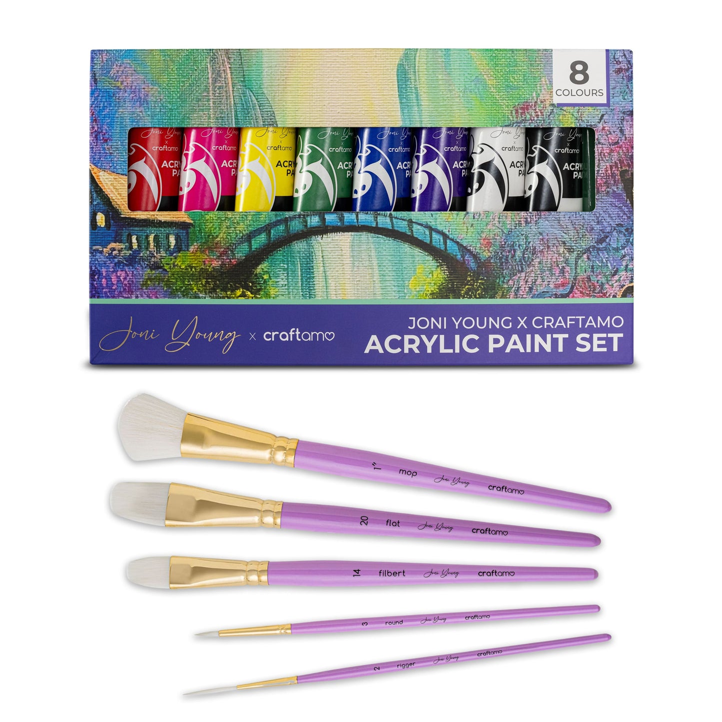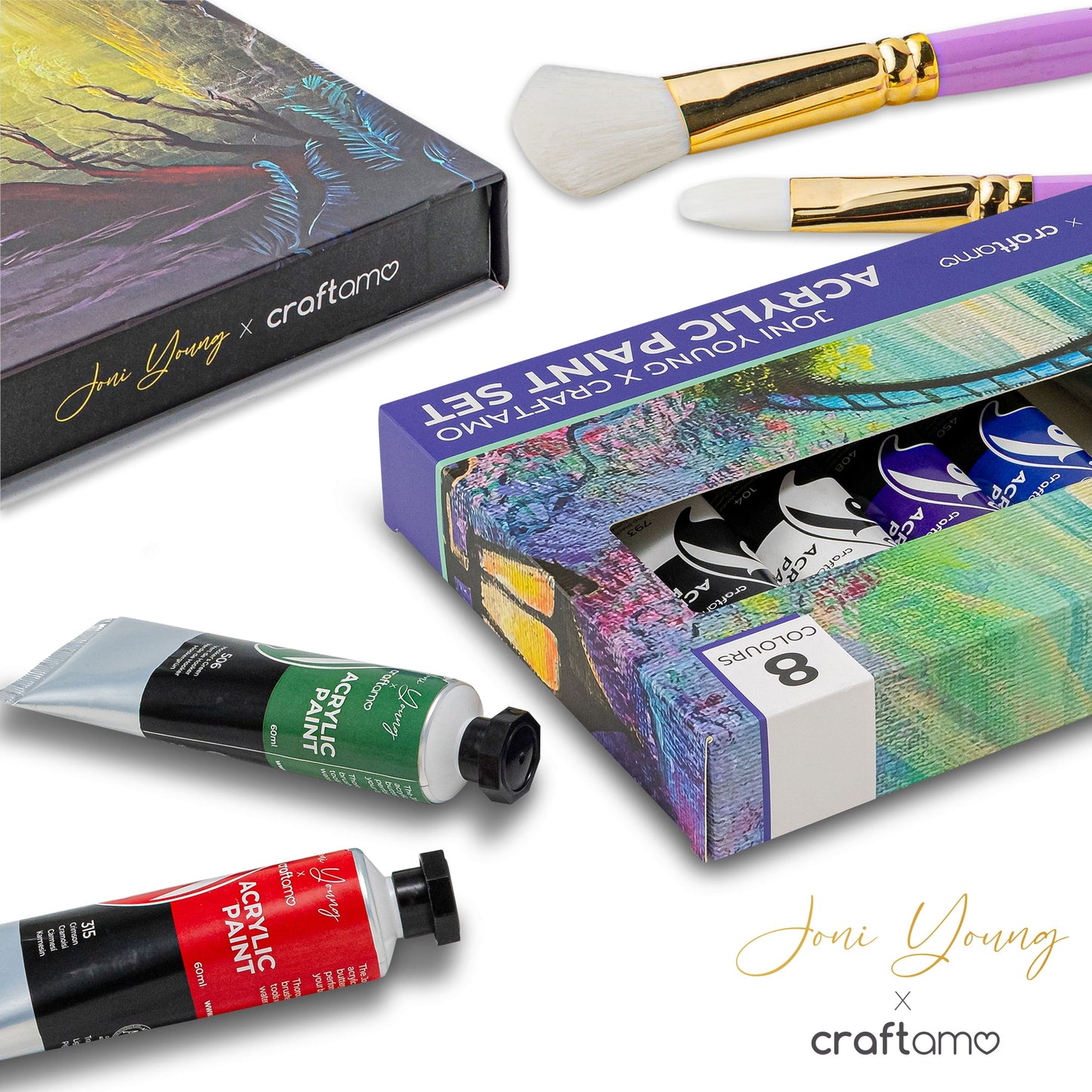 The Joni Young X Craftamo- The Acrylic Lover Bundle brings together two of Joni’s most loved creative essentials: her signature five piece artist brush set and her curated eight colour acrylic paint set. Designed to work beautifully together, this exclusive bundle delivers the tools and colours Joni relies on to paint her glowing skies, dreamlike landscapes, and magical scenes.